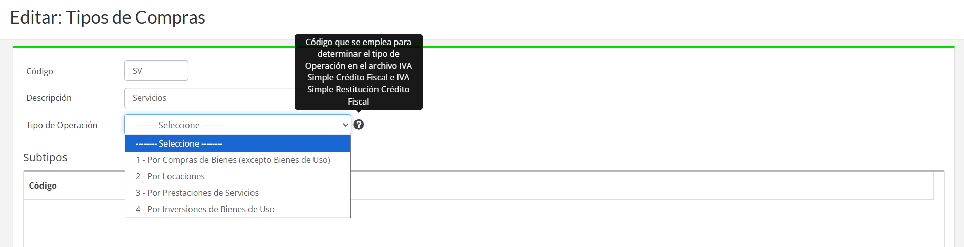Accedemos desde el menú "Padrones >>> Tipos de Compras", donde debemos completar para cada tipo el código de "Tipo de Operación"