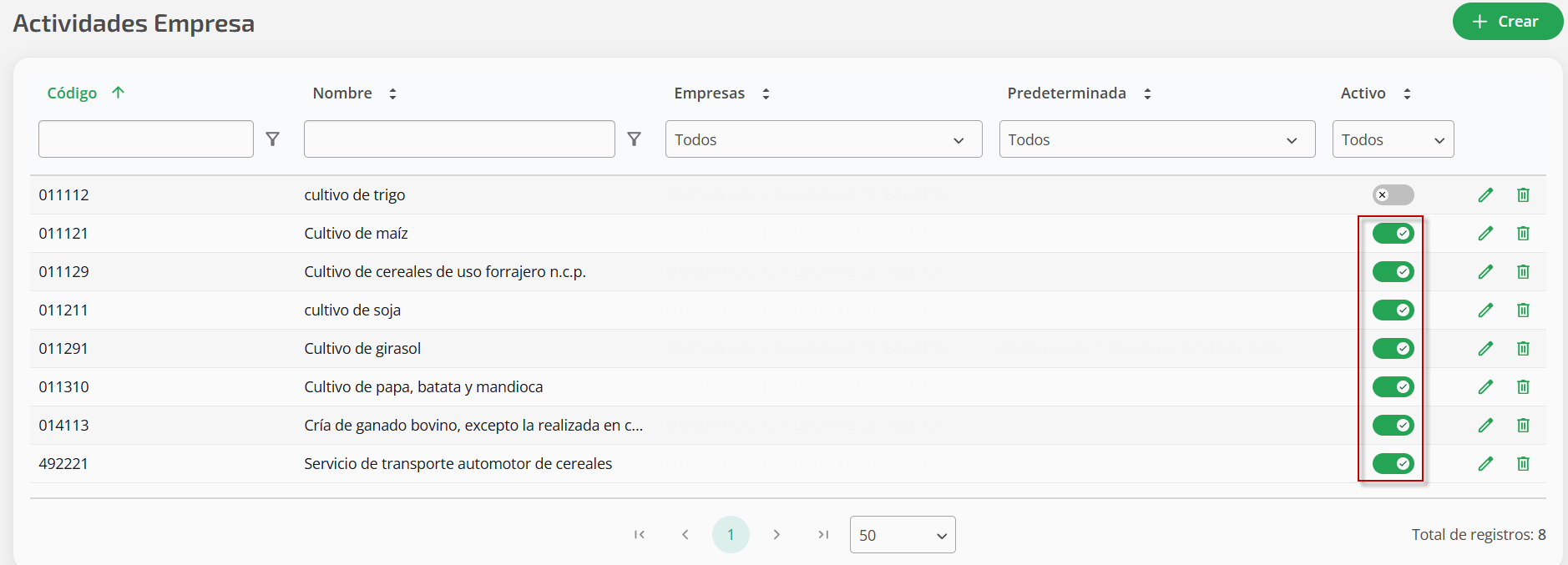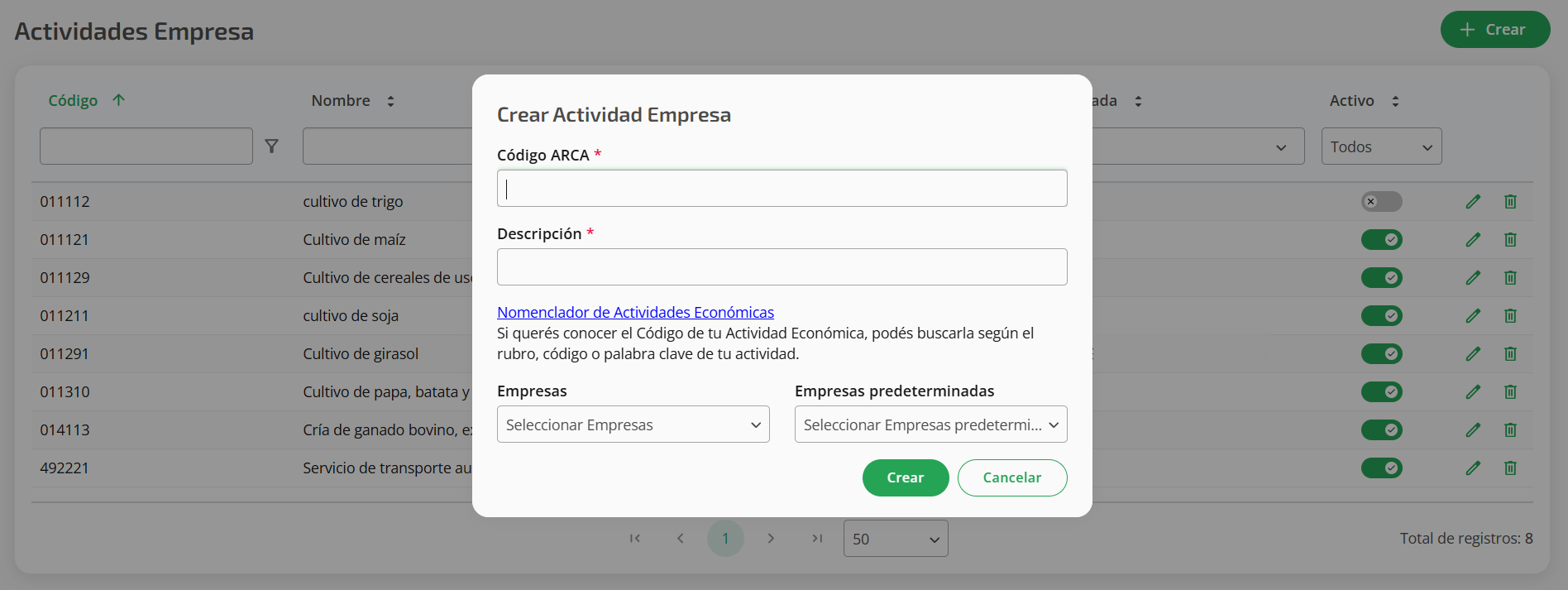 Empresas predeterminadas: Se debe indicar la/s empresa/s en la que esta actividad va a ser la predeterminada.