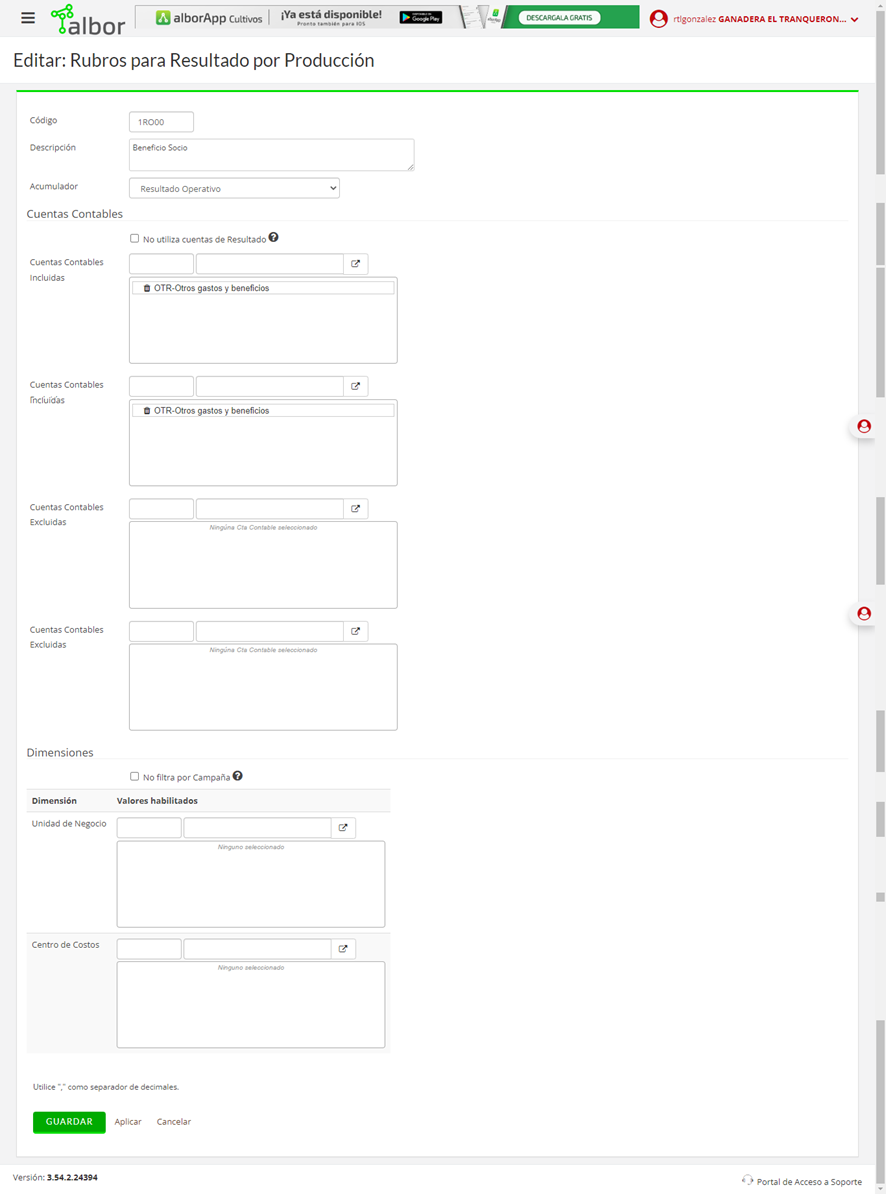 cuenta en los Rubro de resultados por producción: