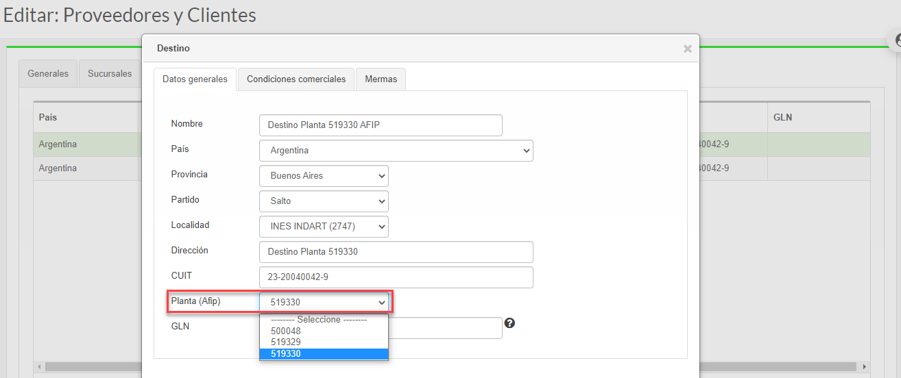 Cuando es destino que se define en el tercero es una Planta el usuario debe indicar el Código de AFIP de dicha Planta. Al indicar el CUIT del destino se muestran los códigos de plantas relacionadas a ese CUIT.