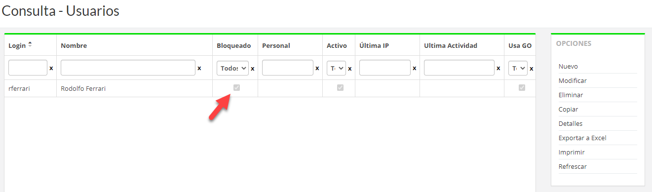 En la grilla de consulta de usuarios el mismo se mostrara "Bloqueado"