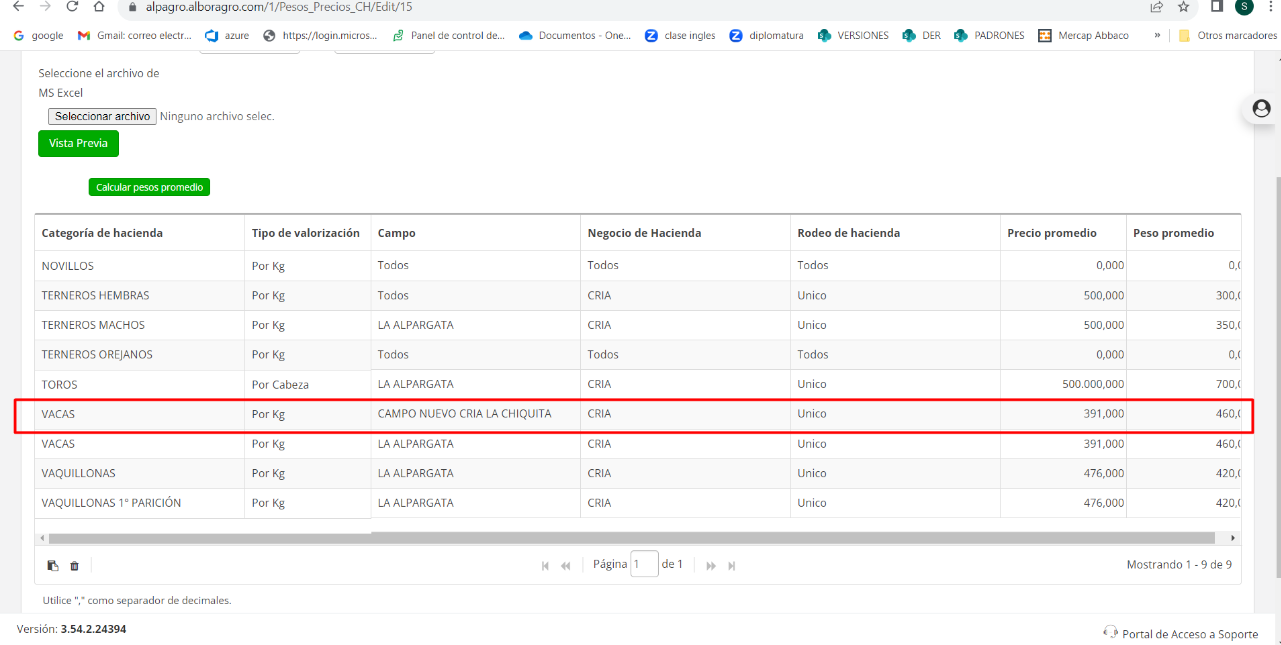 A modo de prueba, se genero una linea con los mismos valores que para el campo "la alpargata" en la tabla de peso y precio Junio-2023 pero para el campo mencionado (luego la misma fue eliminada para que el cliente la cargue con los datos que considere)