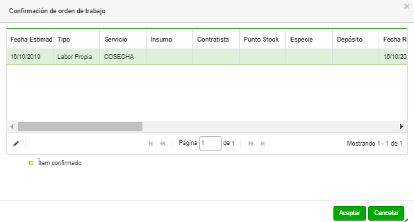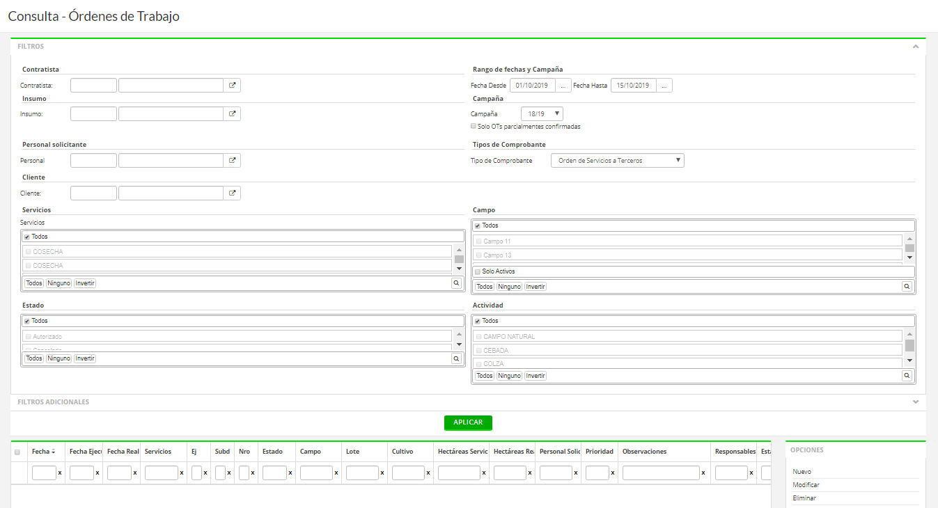 La siguiente grilla es común a todas las Ordenes de trabajo del sistema por lo que depende del tipo de comprobante que venga por defecto se verán las OTs agrícolas, ganaderas u otras por defecto.