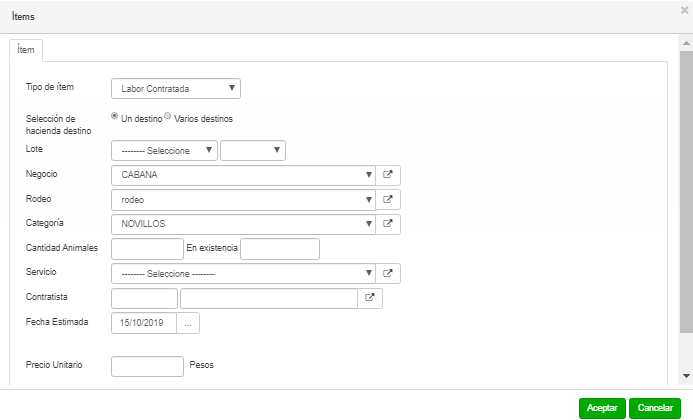 Al cargar cualquier tipo de Ítem está el dato de selección de hacienda destino, cuyos valores posibles son (Un destino o varios destinos)