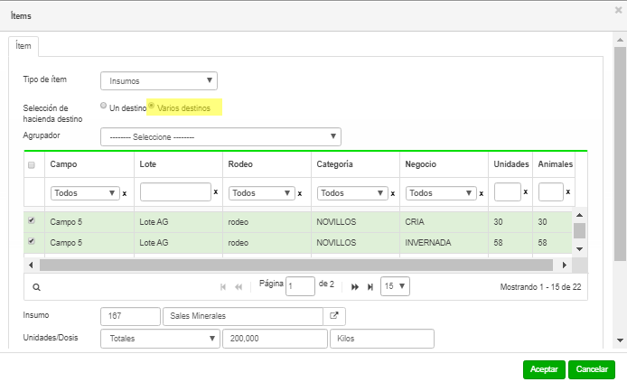 Al hacer clic en varios destinos permite seleccionar hacienda de distintas categorías, rodeos, lotes, negocios desde una grilla en forma rápida, dicha grilla muestra la existencia por campo, lote, categoría, rodeo, negocio.