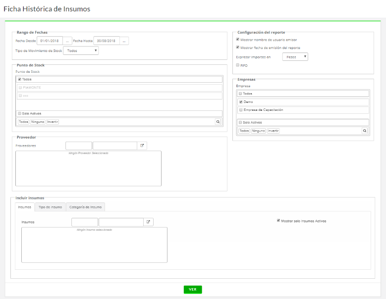 Muestra todos los movimientos de insumos agrupados por insumo y por fecha.