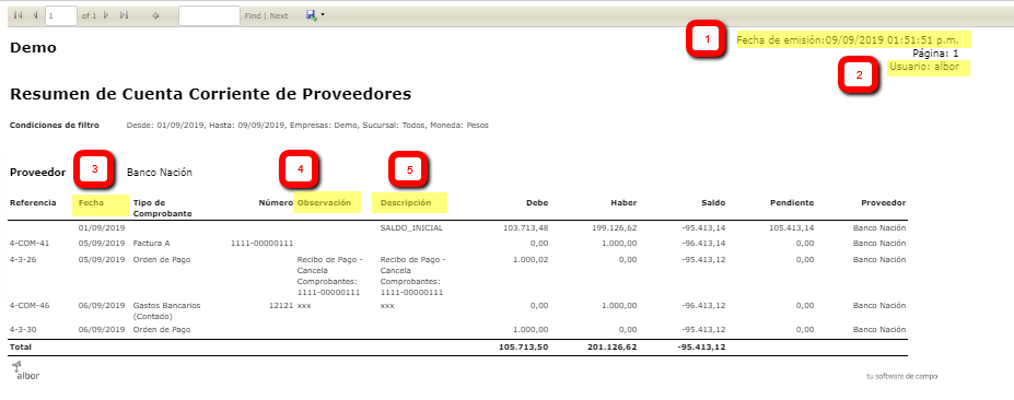 Pendiente: muestra el pendiente del comprobante. Uno de los controles más comunes es verificar que la suma de los pendientes (teniendo en cuenta si suma o resta) coincida con el saldo de la cuenta corriente ya que si está todo bien aplicado debería coincidir.